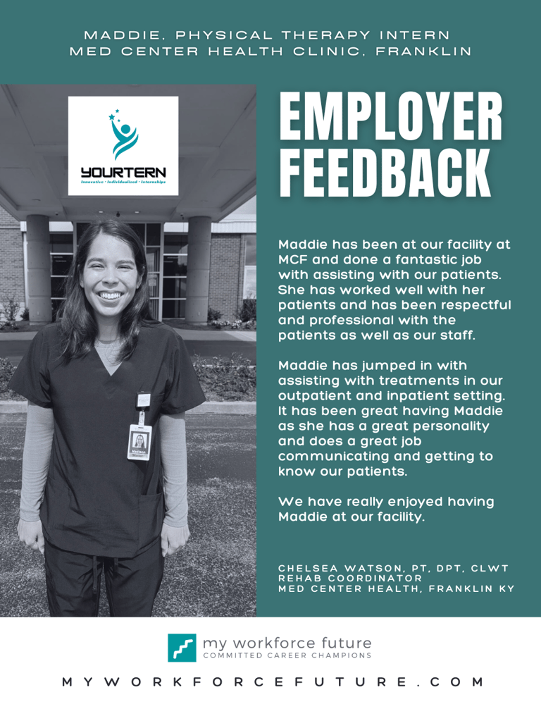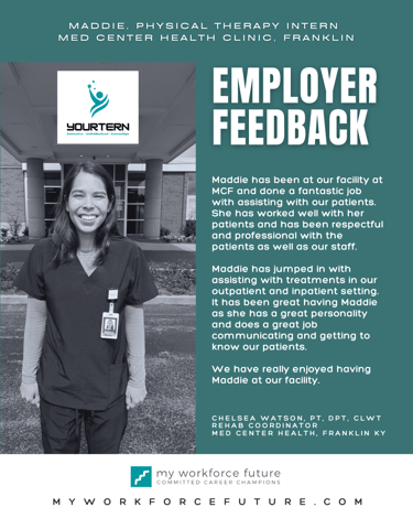 In her testimonial, Rehab Coordinator Chelsea Watson highlights Maddie’s compassion, professionalism, and eagerness to learn as standout qualities that have made her a strong addition to the rehab team. Her journey shows just how powerful internships can be in preparing future healthcare professionals to make a real impact—one patient at a time.