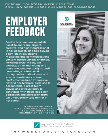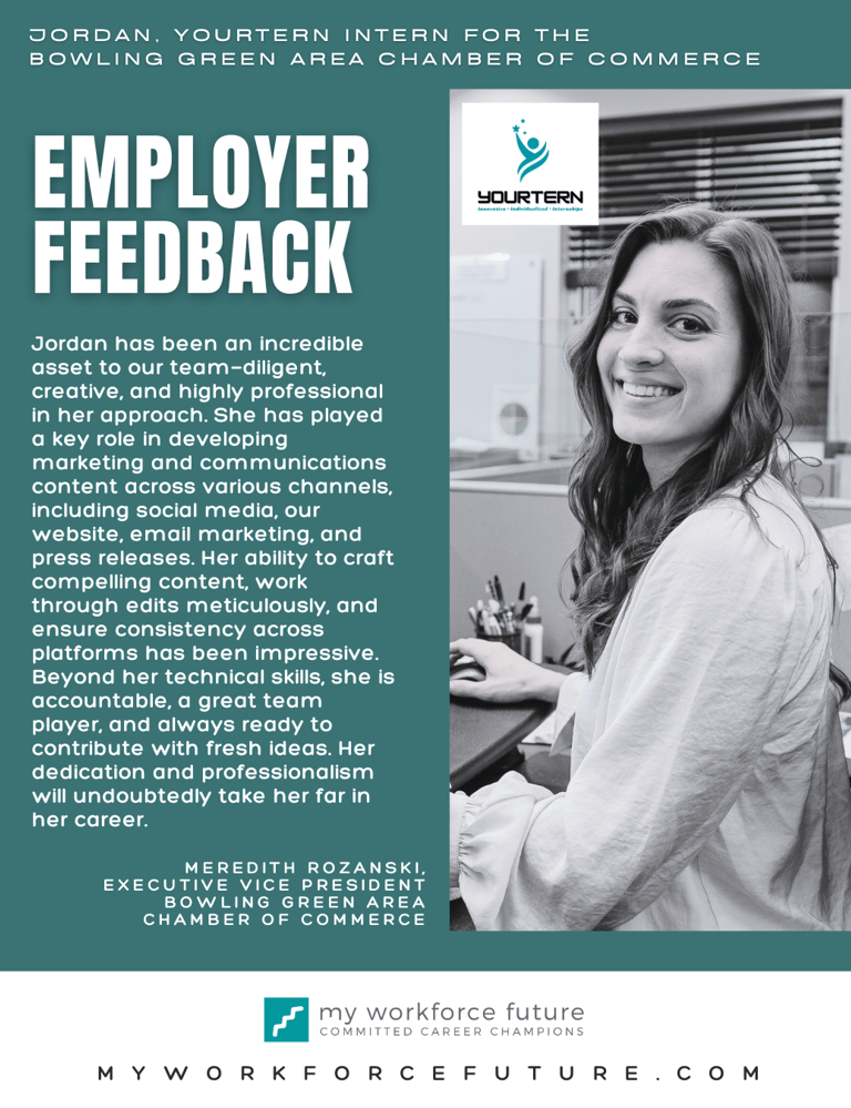 In their testimonial, the Bowling Green Chamber shares just how impactful Jordan has been during her internship, highlighting her dedication, creativity, and work ethic as key strengths that make her a valuable team member. Her success story is proof that there’s no substitution for internships with hands-on work experience!